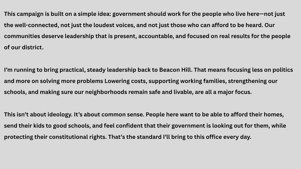 Families are feeling squeezed from every direction—housing, groceries, energy, and taxes. I will push for policies that bring real relief, support small businesses, and make it easier for people to stay and build their lives in this district.